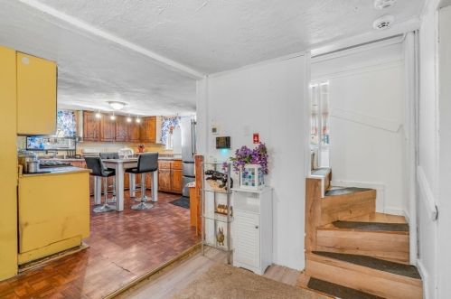 Description: Intext: strip & reshingle roof, install 1.5 sq of rubber roofing, install 21 replacement windows, install 3 doors, repair rear platform & stairs, repair front stairs